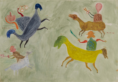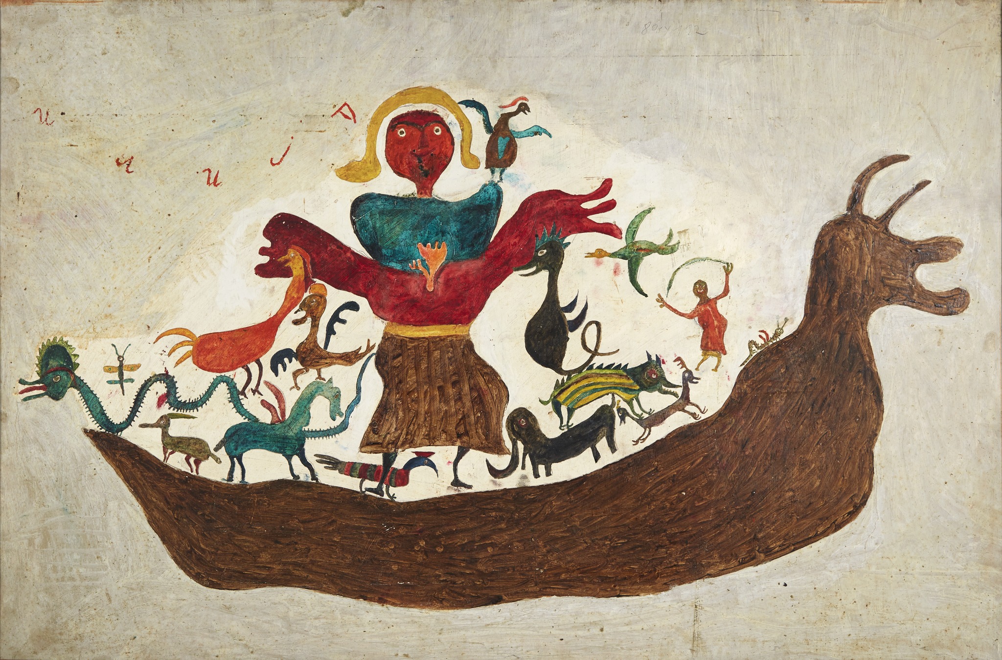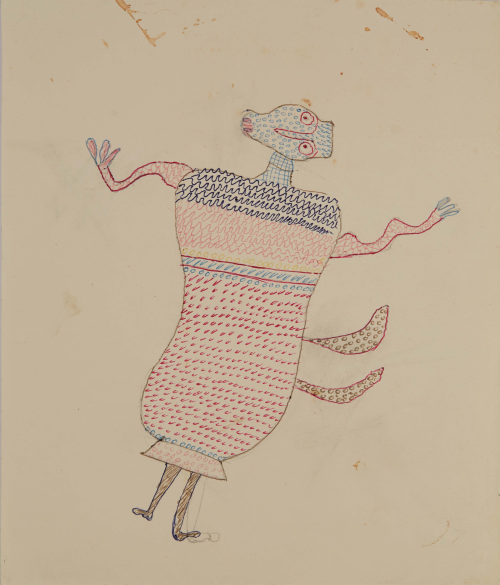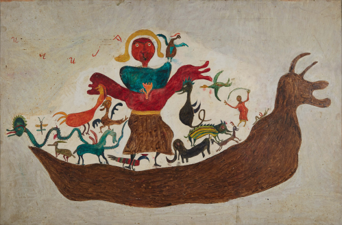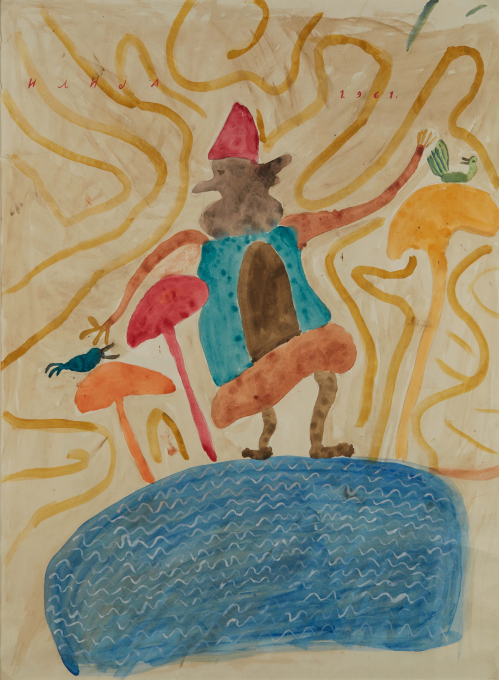 In 1957, at the age of sixty-two, nearly destitute and physically diminished, Ilija picked up a brush and began to paint. He started with small drawings and later moved on to decorating the walls and furniture of his home; when materials ran out, he painted on books. His first public appearances were met with open skepticism. His son, by then an art historian, destroyed his first drawings, but soon saw the promise the work held and exhibited Ilija’s work under the pseudonym “Bosilj.” Was it possible, critics asked, that an uneducated peasant from Srem could produce work of such imagination and invention? He was required to appear before a special committee in Zagreb to draw and paint before them, to prove authorship of his own work. He received a certificate of authenticity, and continued.