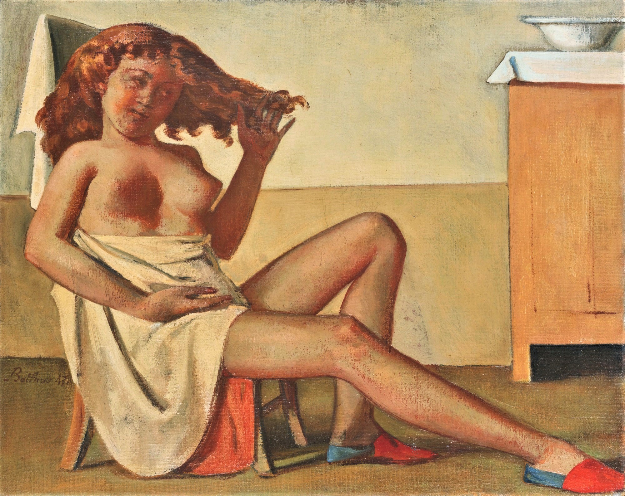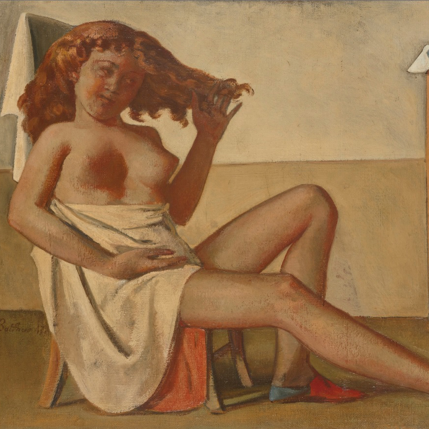 Balthus (b. 1908) was born in Paris, France to Polish parents, who were both artists and supported his aspirations of following in their footsteps. Unfortunately, his adolescence occurred during a period of great social upheaval, causing his parents to move him to Berlin at the advent of WWI. They soon divorced, and Balthus was forced to split his time between Switzerland and Germany, allowing him to immerse himself in two very different cultures. Once an adult, he moved back to Paris to pursue artistic education. Despite the burgeoning avant-garde movement at the time, he was compelled to embrace classical technique, leading him to study Old Master painting at the Louvre before going to Rome to study frescoes at the Quattrocento. In the beginning of his career he took portrait commissions and designed sets, but after his first solo show, he began to create large scale paintings of interiors and landscapes, often populated with young girls and teenagers in sexually revealing poses. He favored a muted palette which lent his works an energy of eeriness and eroticism. Throughout the years he faced many controversies surrounding his depictions of young girls, even being accused of pedophilia, but prevailed in the art world regardless. Reclusive and secretive, Balthus believes in the art of privacy and thinks his personal life should not be relevant to the works he creates. Despite pushback, he remains lauded, and by the end of his illustrious career he had the opportunity of showing the the Museum of Modern Art and the Metropolitan Museum in New York City, the French Academy in Rome, and the Georges Pompidou Foundation in Paris.