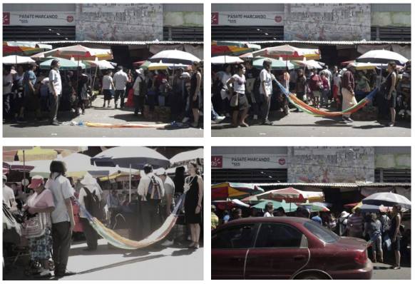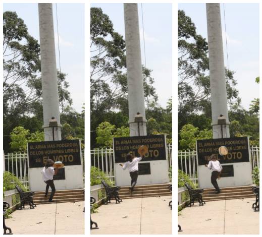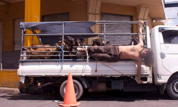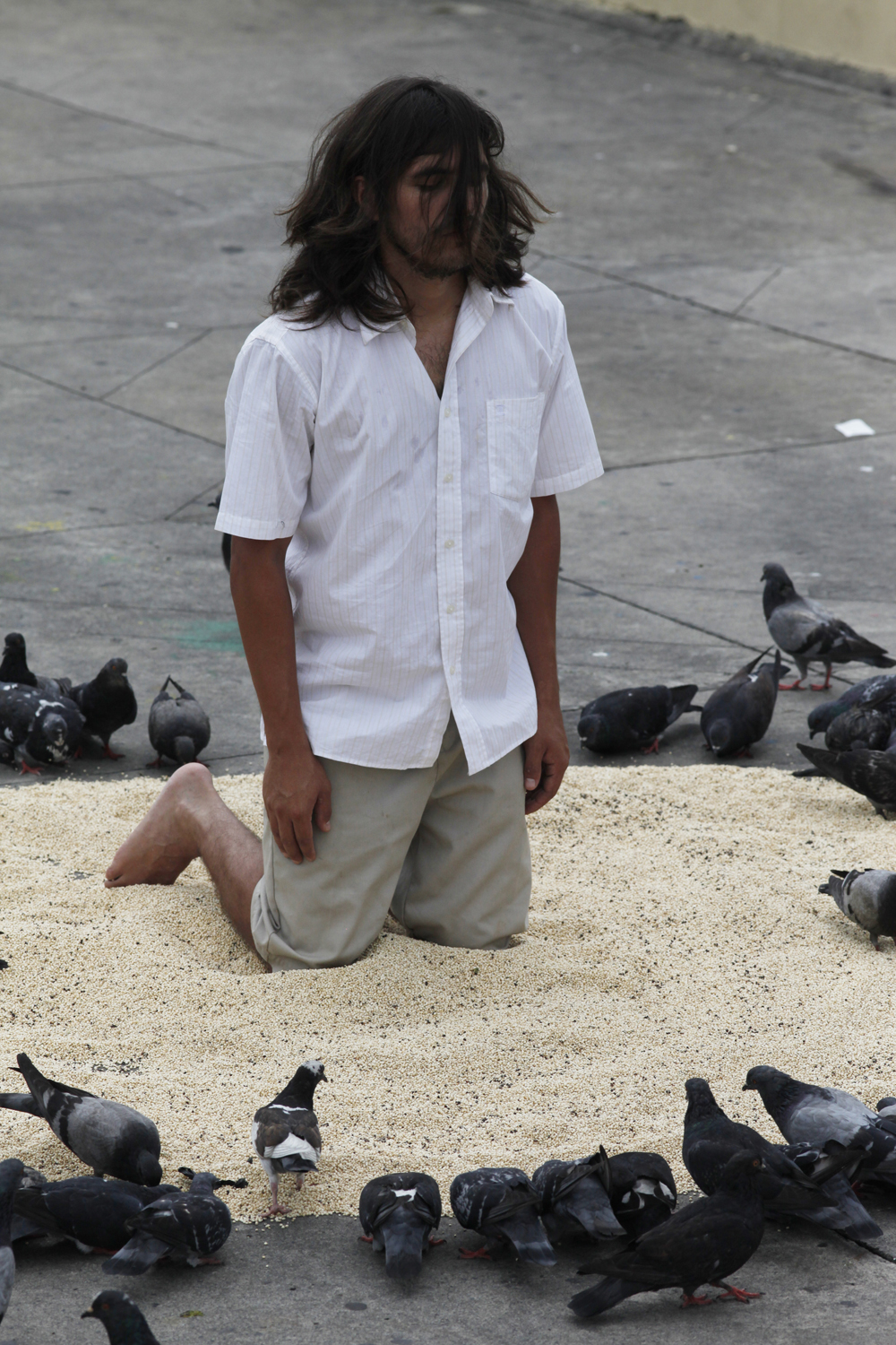 Crack Rodriguez lives and works in El Salvador and is a Member of the artist collaborative the Fire Theory. Through his “acciones” carried out in the streets of El Salvador, Crack Rodriguez aims to inspire consciousness and questioning among the public, in particular by forming relations with Salvadorans who aren’t directly connected or concerned with the art world. Since its bitter civil war ended in 1992, El Salvador has been ensnared by rampant gang violence and political corruption, and currently has one of the world’s highest murder rates. Rodriguez’s practice is a reaction to the widespread corruption and elitism of a government that trumpets the power of the vote and the people to control their own destiny. His performances are daring, innovative responses to the ongoing paradox of a country that claims to be a democracy, yet seems to function counter to the interests of the wider public.