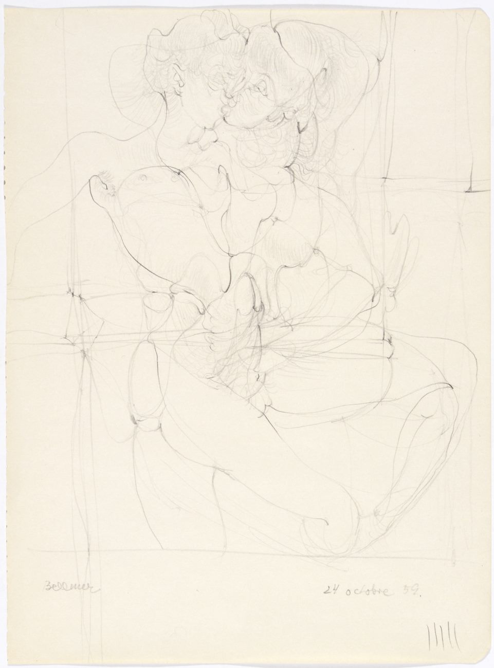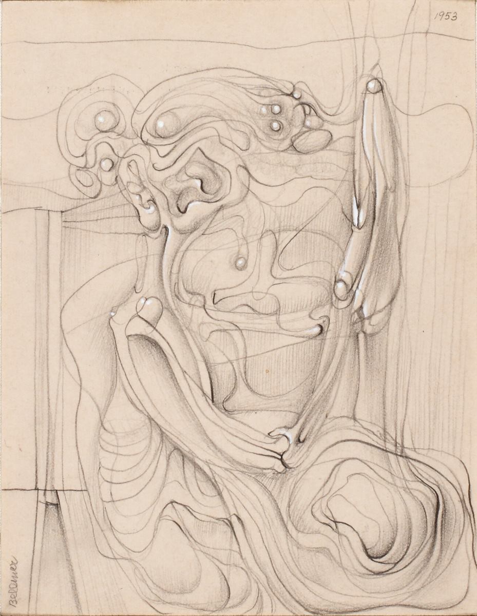 Hans Bellmer, a Surrealist who—although under appreciated during his lifetime—continues to be highly influential to artists today, created an emotional, intellectual and erotically charged body of work. Bellmer is best known for a series of photographs of two life-sized adolescent female dolls, which he constructed and photographed between 1934 and 1938. The lighting and staging—with their nods to German expressionist cinema, Renaissance religious painting and illumination, and explicit fetishism—allowed Bellmer to establish a sexually-laden atmosphere and to realize a personal language of desire. The artist intended, in his own words, to “make it possible to recreate physically the dizzying heights of passion and to do so to the extent of creating new desires.”