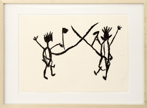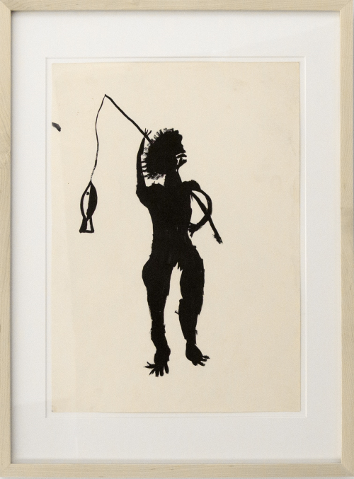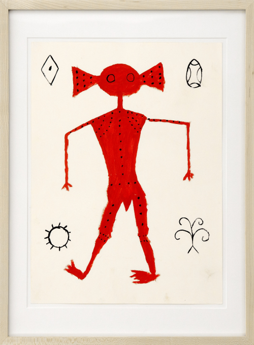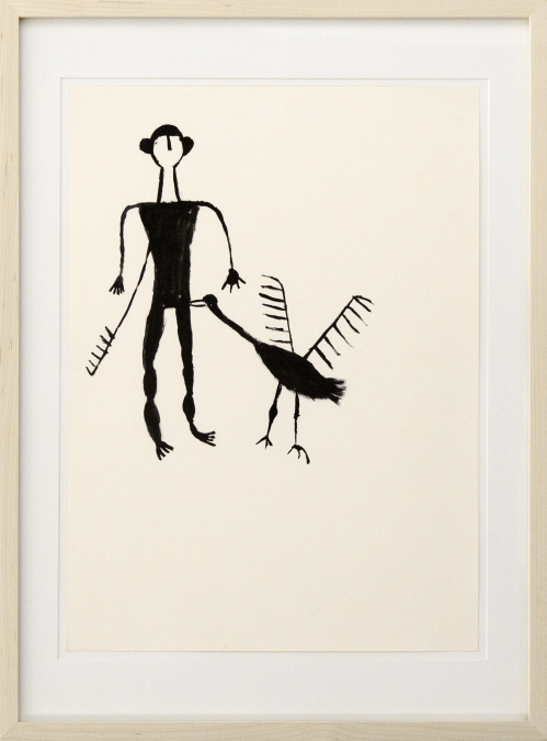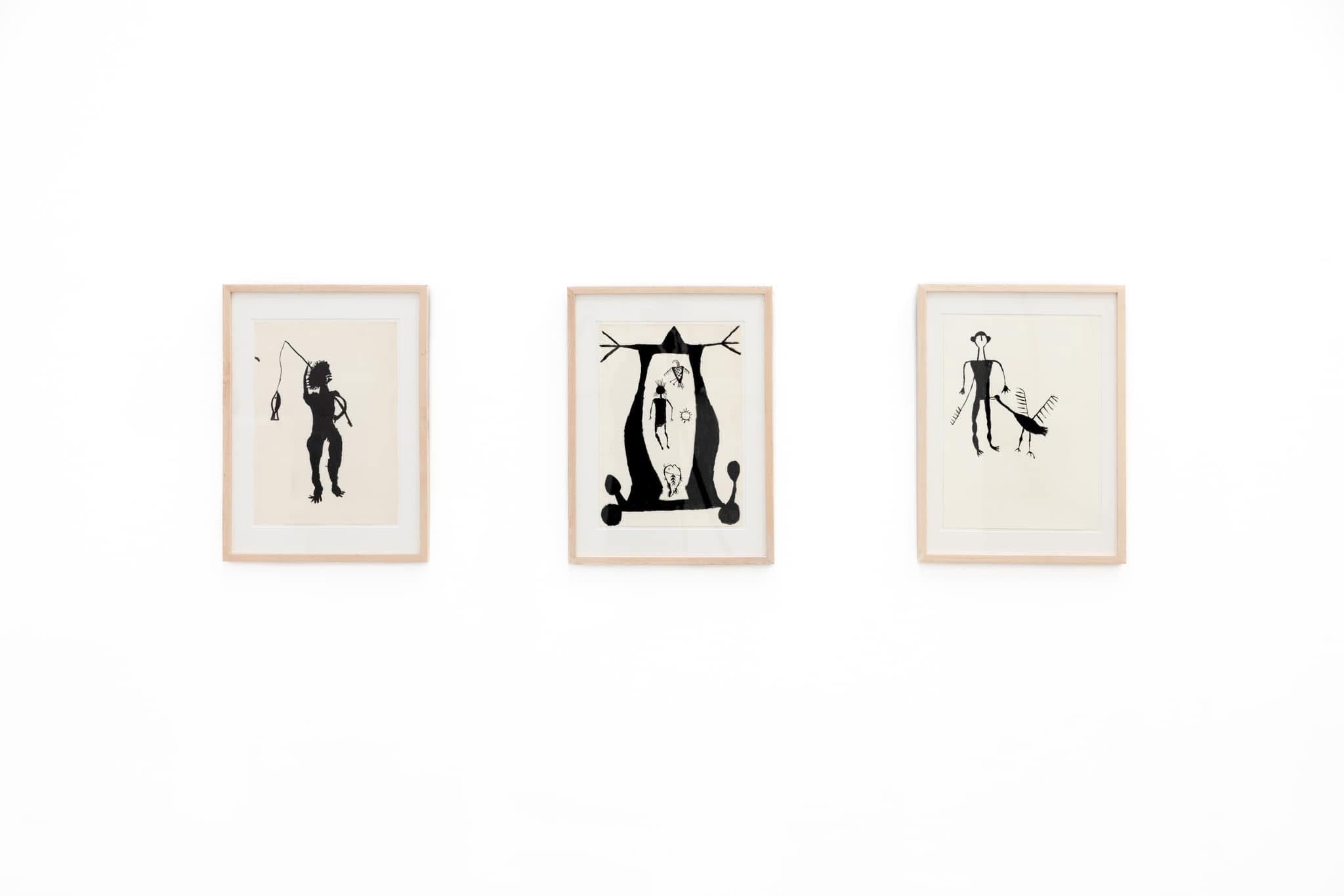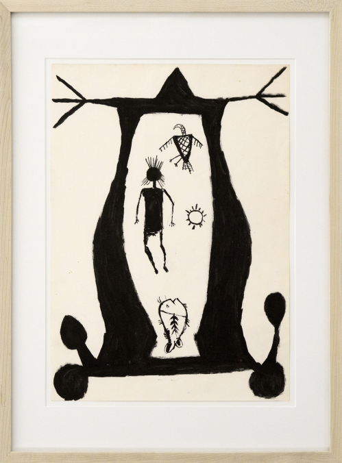 This exhibition pulls exceptional examples from Pinnheiro’s extensive collection of over 300 drawings, and pairs them alongside significant Modern works. The work of Carla Prina, a founding member of the Altamira School, CoBrA co-founder Ernest Mancoba, and visionary Modernist Man Ray all bolster the inherent, though subtle, gestalt nature of these Amazonian drawings. Prina was inspired by the Altamira cave paintings, and her paintings privilege color and dynamism in order to capture an abstracted natural equilibrium. Her paintings are a wonderful compliment to the Amazonian drawings, many of which also communicate complex ideas about nature and balance with open-ended visual language. Mancoba began his artistic career as a sculptor, but took up abstraction in protest after finding colonial prejudice against Africans working in Modernist modes. His approach to abstraction, which mirrors that of the Amazonian artists, was additive, not subtractive, guiding viewers toward a rich, but hidden, network of culture and tradition. Man Ray’s surreal drawing, Corps de Femme (1954), interpolates elements of primitive art and, when compared to the Amazonian drawings, demonstrates the difference that content and approach make in minimalist drawings. Man Ray’s work is built from a different cosmology than the Amazonian drawings, and has a totally different sensibility, the comparison of which allows us to see the Amazonian drawings as deeply engaged with their cultures of origin.