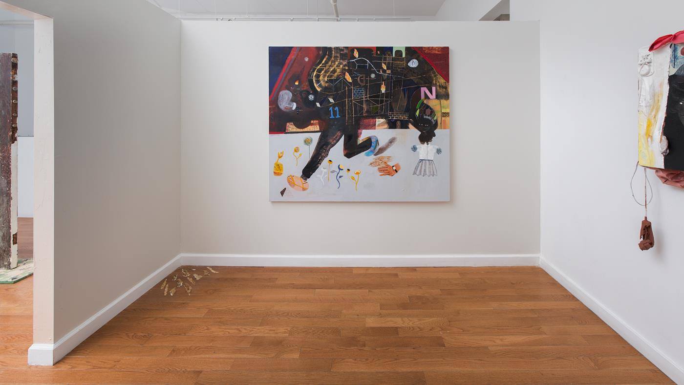 Although Rivero’s work often begins with explorations of color, texture, and with mark making, the artist says he assembles these stories not through formal mechanics alone, rather the materials themselves—such as the sweep piles, house paint, and salvaged paper he often utilizes—possess complex identities and specific historical auras. However, personal history is muddled, mingled with other histories: a small vignette about a character’s tortuous loyalty to the Yankees is entangled with a larger narrative of identification with heroic cultural icons.