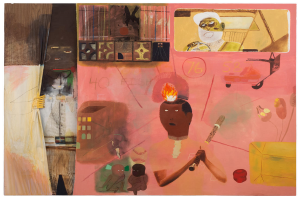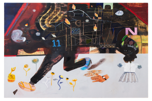 I Can Love You Better takes its name, in part, from a 1997 Mary J. Blige record, and like its namesake, is intended as an intimate offering or a private plea. The work does feel private, perhaps even lonely. It is representative of Rivero finding an intimate space for himself in all this sociality and layered identifications: simultaneously being and becoming American, being a musician and a maker of images, drawing on Afro-diasporic religious practices, and making them a source of play in his practice. His paintings are visual allegories without the moralizing finish; characters and objects weave together to make a rye, slightly askance look at personal narrative.