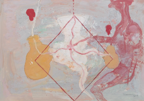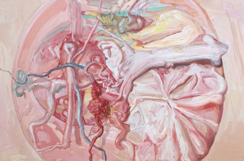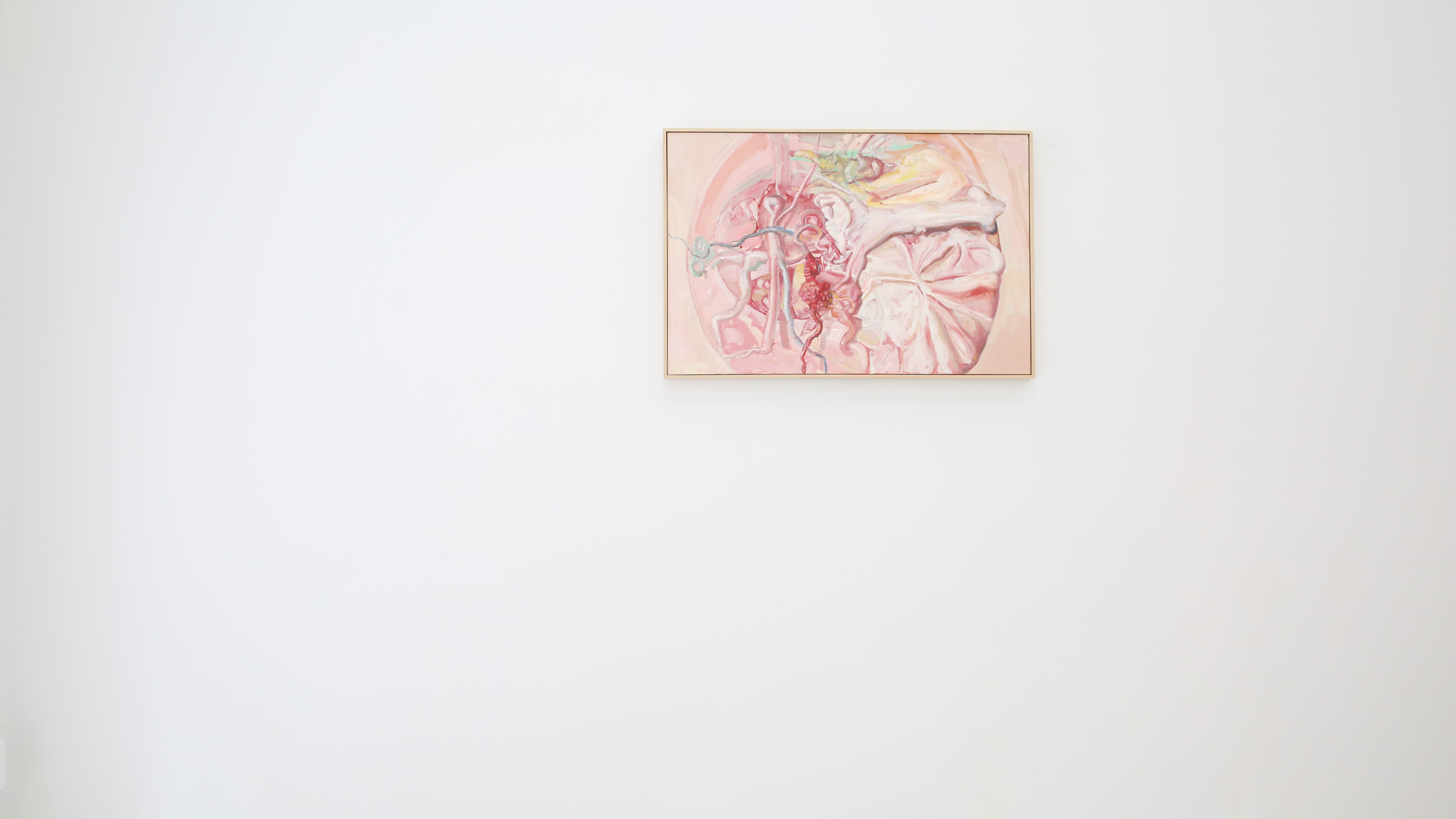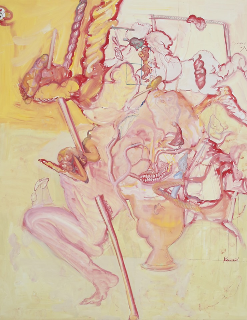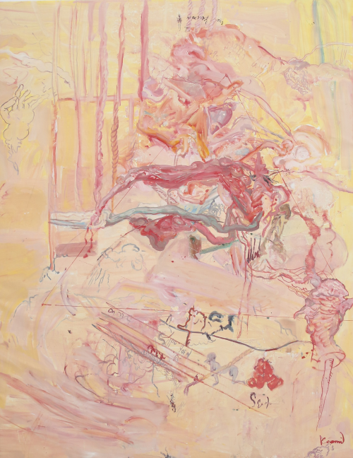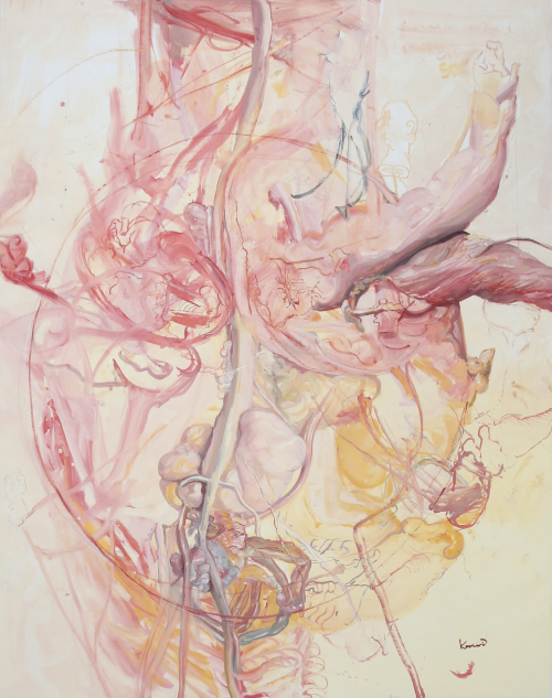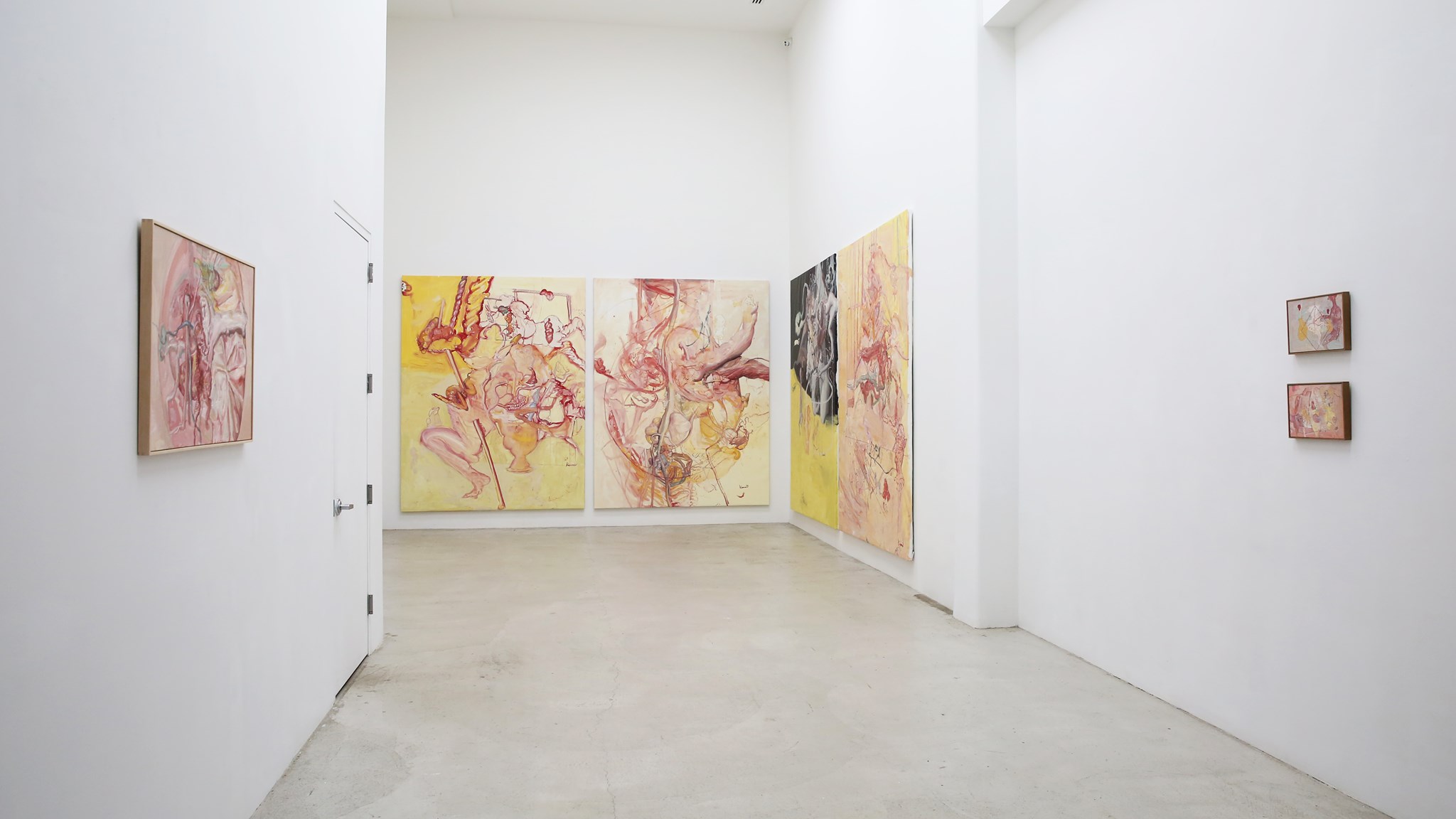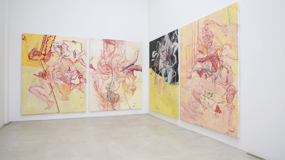 The painterly execution creates a fluidity that emphasizes the brevity of the palette; its gestural nature mirrors the artist’s movements showing the unification of both mind and body. With emphasis on spontaneity and sensuality Lee’s work is evocative of Mannerist and Baroque painters, such as Jacopo Comin Tintoretto and Peter Paul Rubens. Through the use of confident and intuitive brushstrokes, Lee reveals similarities between his creations and the masters before him. Inverse to his earlier works of darker color palettes, the exhibition highlights lighter tones of yellow and pink that give a luminescent effect. The figurative-like forms that had occupied Lee’s earlier works are no longer dominant here; instead, the swiftly rendered brushstrokes add presence to the paintings. Still, the artist continues his infatuation with bodily forms in his new visceral series that aids the assimilation of the diabolic inside of him and through the expression of his brush to canvas- makes his hallucinations universally tangible.