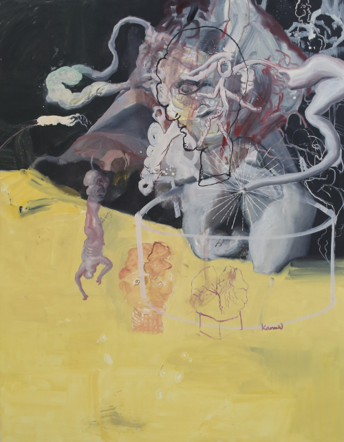 Lee’s works flow from mind to canvas without plan or design prior to the piece’s creation, producing a vast inferno of entangled flesh and phantasmagorical gestures. The young artist’s paintings exude emotional intensity in both the concept and the aesthetic. In the exhibition, Lee chooses to work on a monumental scale, engulfing the viewer into his introspective contemplations. Given the scale, the art demands to be seen whilst the content demands to be felt. Lee’s concepts give density even with the thin painterly strokes that cover the canvas like a haze.