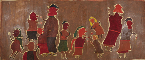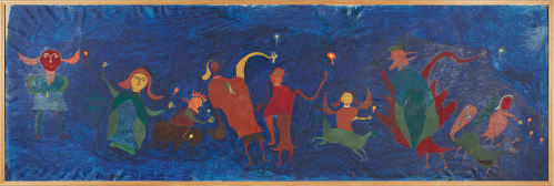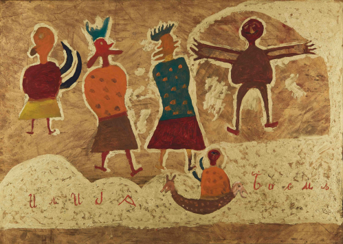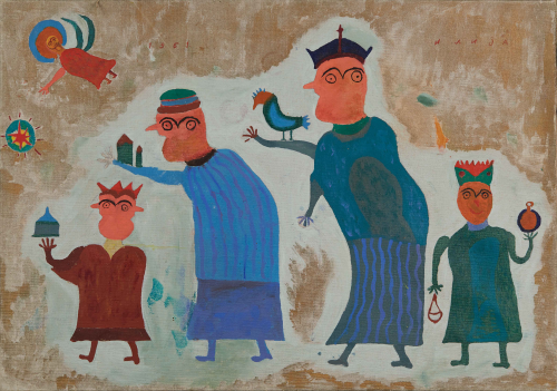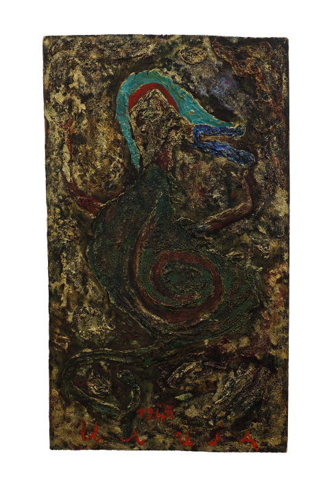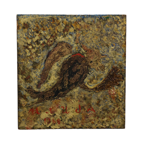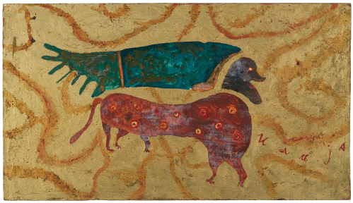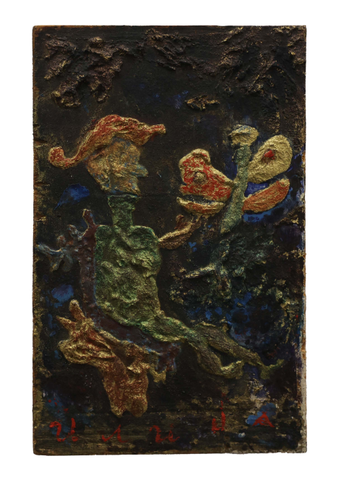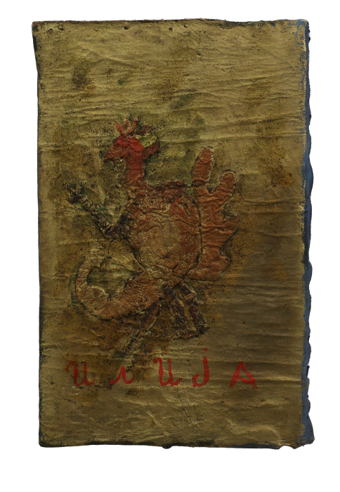 His compositions exist outside conventional pictorial rules. The architect and critic Vjenceslav Richter described Ilija’s work as “a free, anti-artistic play.” His works grew alongside him, beings and structures mutating and populating the canvas with lives of their own. In the final years of his life, Ilija entered what he himself named the “thick gold phase”: images no longer made with paint but shaped from oozing bronze powder, poured and sprinkled onto a base and then slowly painted over. The beings in these late works have unidentified physiognomies—no longer quite people or animals, but something further, something that belongs entirely to the realm of imagination.