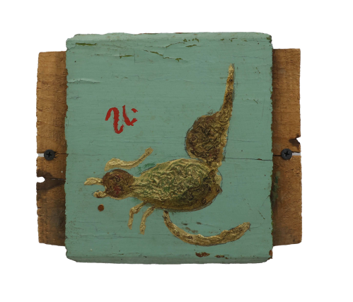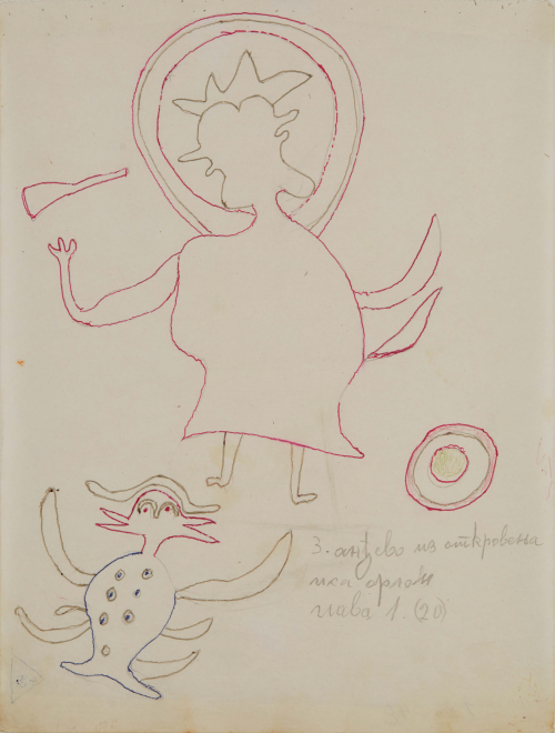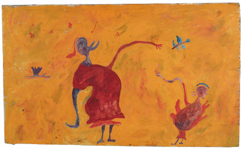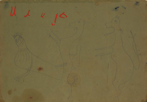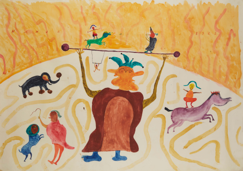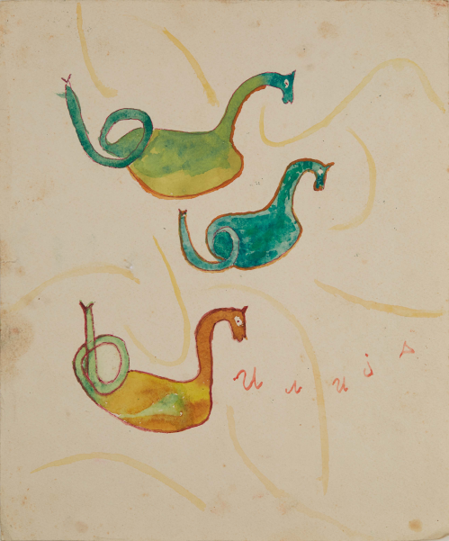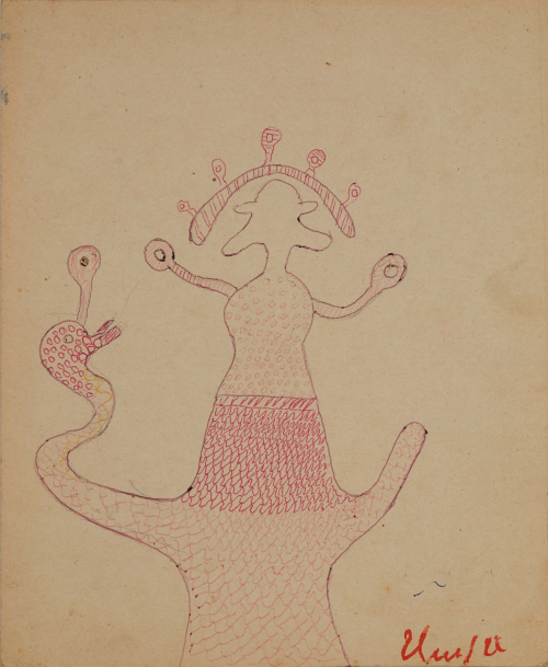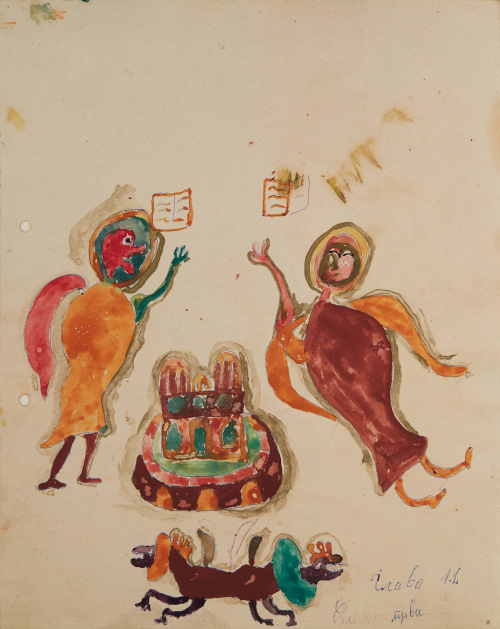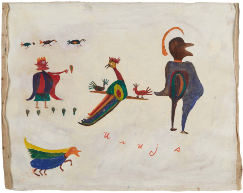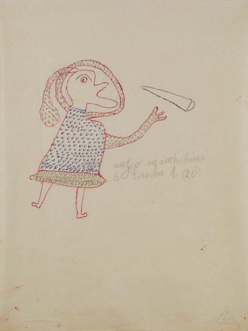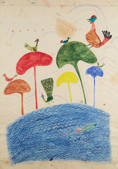 In 1957, at the age of sixty-two, nearly destitute and physically diminished, Ilija picked up a brush and began to paint. He started with small drawings and later moved on to decorating the walls and furniture of his home; when materials ran out, he painted on books. His first public appearances were met with open skepticism. His son, by then an art historian, destroyed his first drawings, but soon saw the promise the work held and exhibited Ilija’s work under the pseudonym “Bosilj.” Was it possible, critics asked, that an uneducated peasant from Srem could produce work of such imagination and invention? He was required to appear before a special committee in Zagreb to draw and paint before them, to prove authorship of his own work. He received a certificate of authenticity, and continued.