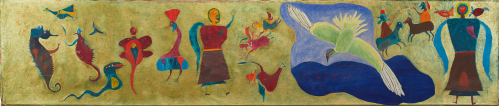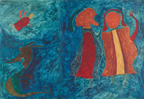From the pain of his life there emerged an expansive inner universe he called Ilijada: a utopian world where people and animals coexist in joy, counterbalancing the horrors he had witnessed. Though he rarely discussed it directly, referring only to “some Ilijada of mine,” elements of that world recur throughout his work: winged figures and flying families released from gravity, lovers wielding flowers and visible hearts, double-headed and two-faced beings, hybrid creatures caught between states, strange animals released from any natural prototype, shimmering gold. The elements of his imagined world were deeply philosophical, not merely decorative.
